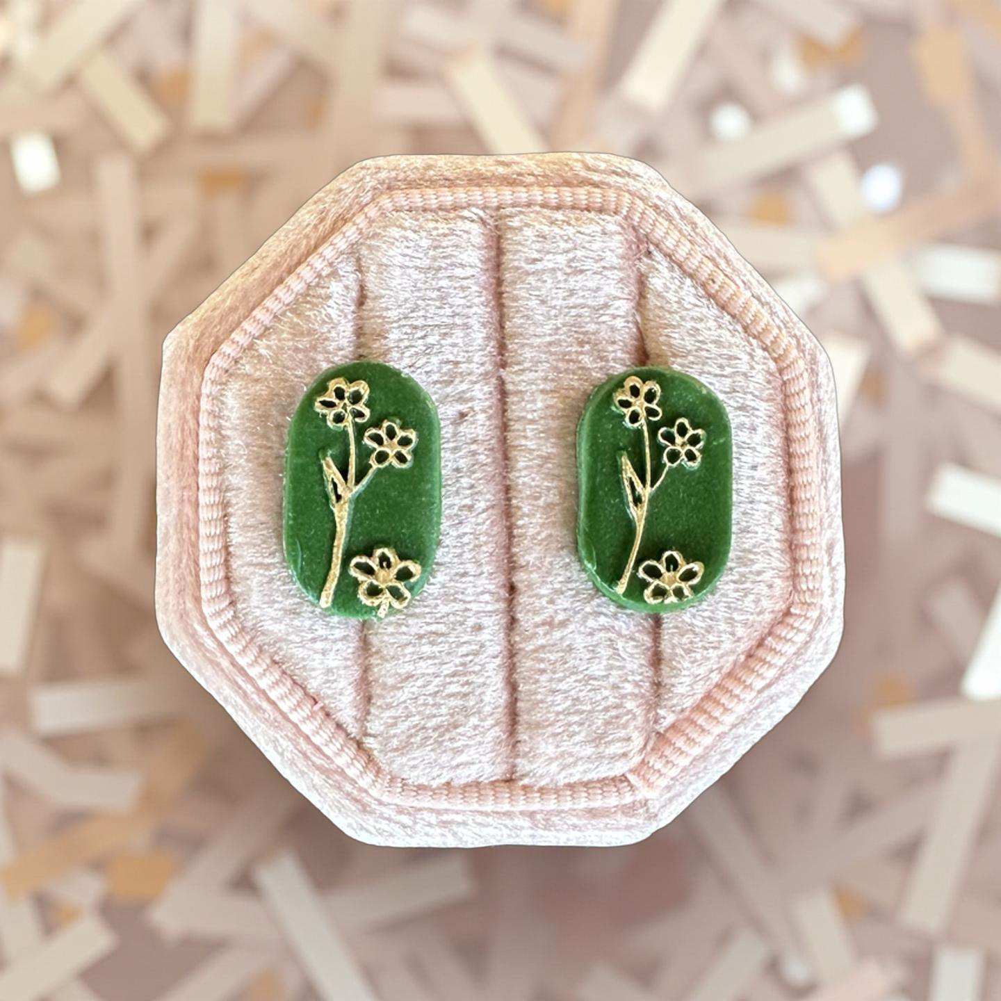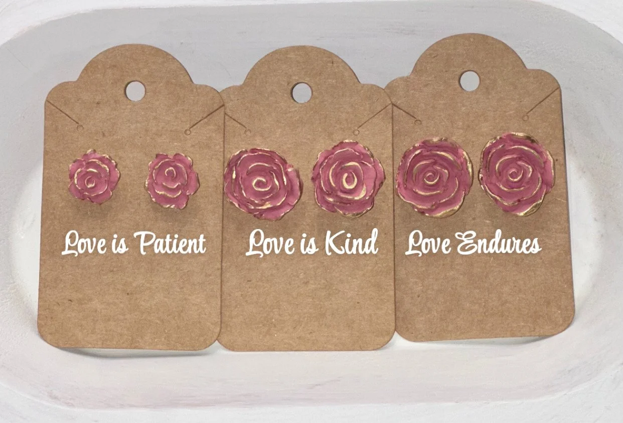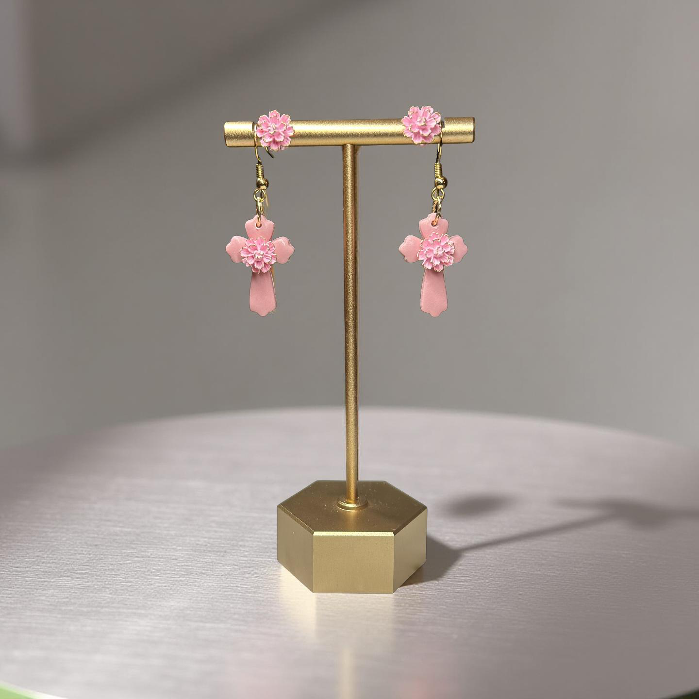 A beautiful 3D clay flower placed on the center of a dusty pink cross and finished with hypoallergenic 18k gold plated fixtures. A second set of matching stud flowers make this set complete.