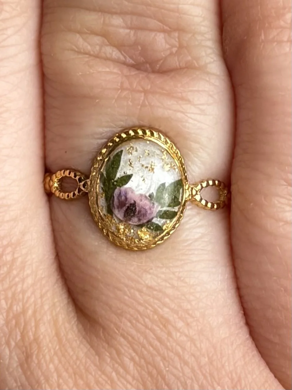 • Oval center stone made with resin and real dried flowers