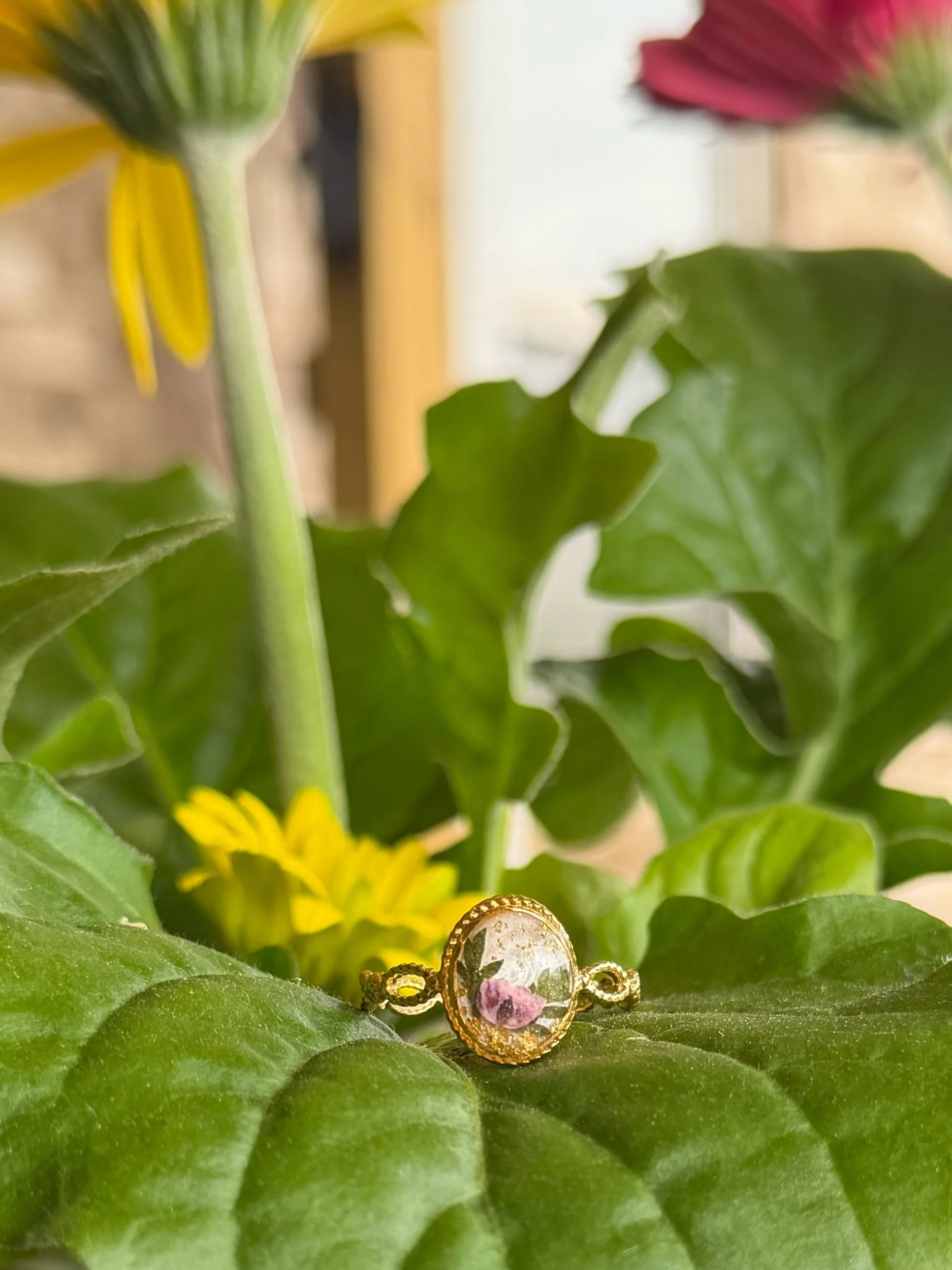 This gold-plated ring features real preserved delicate flowers, carefully set in crystal-clear resin and finished with subtle touches of gold flake. Each piece is one-of-a-kind—capturing a moment of nature, preserved forever in a timeless design.